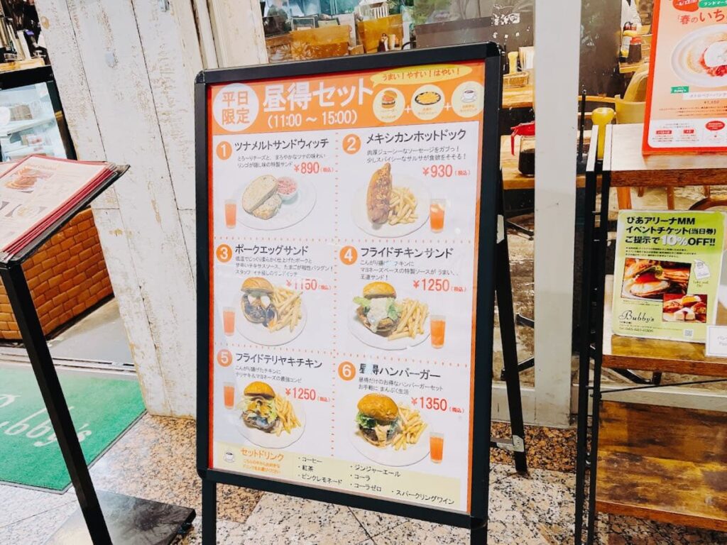 バビーズ ランドマークプラザは、みなとみらいで雰囲気のあるランチを楽しみたい人に向いています。パンケーキやアップルパイの印象が強い店ですが、実際にはバーガー、ホットドッグなどの食事メニューもあり、食べ応えのあるランチを提供しています。