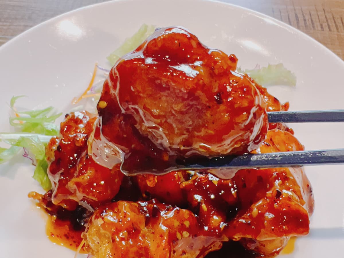 こちらが鶏肉唐揚げの甘辛ソースがけ。