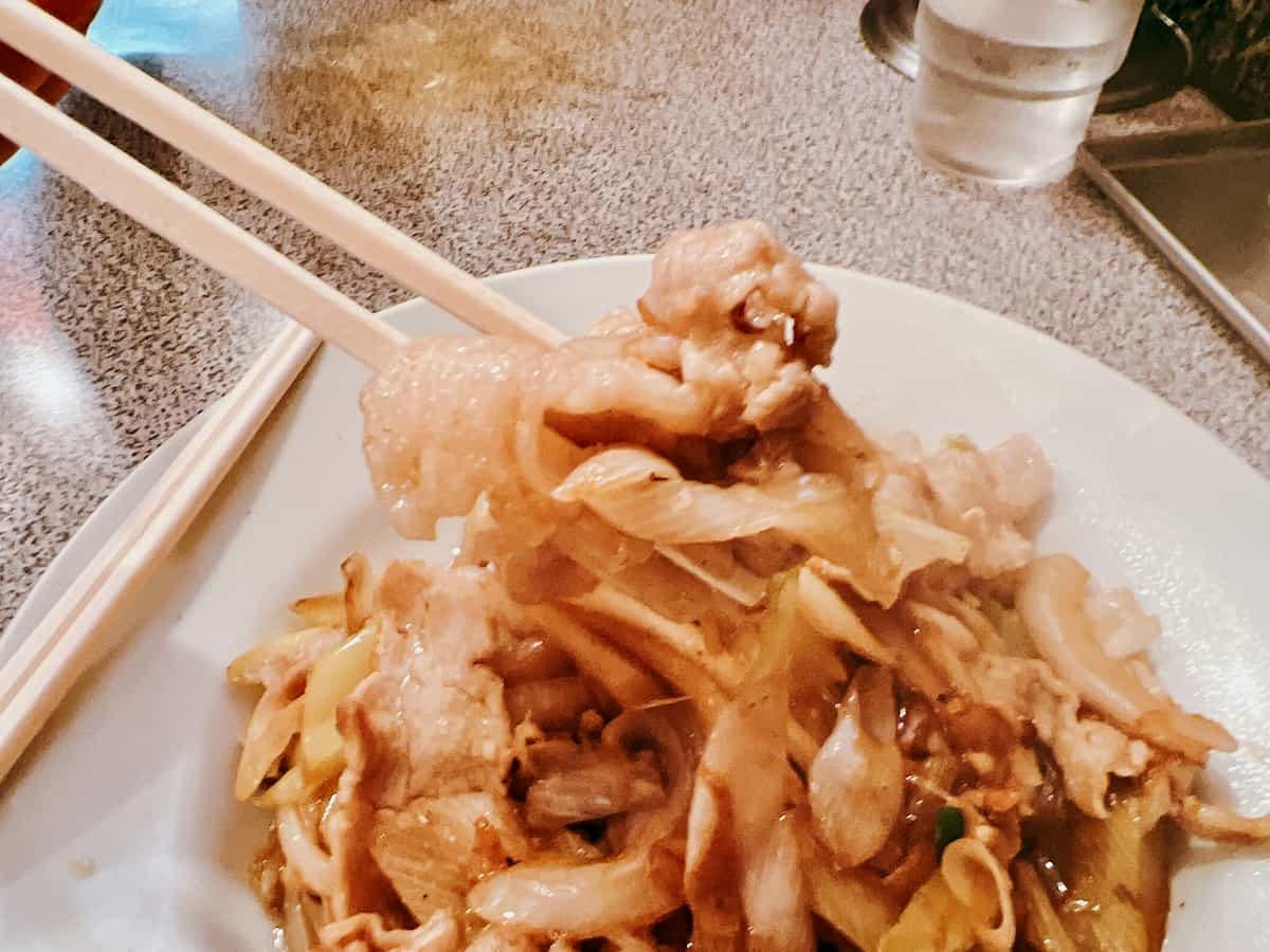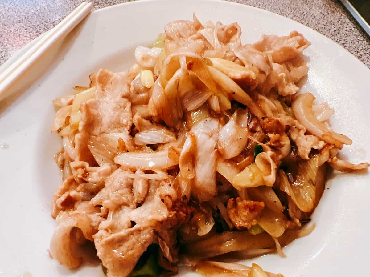 ピリ辛でニンニクの効いたソースにたっぷりの豚肉と野菜が入っています。
