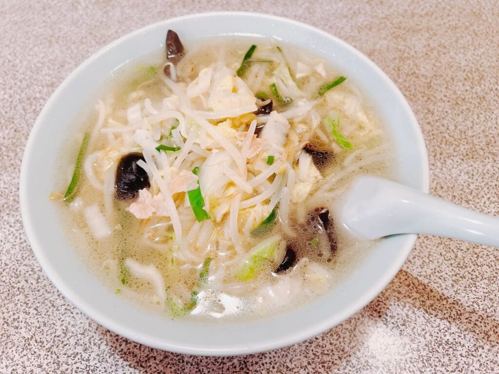 看板には“ぎょうざ・たんめん”と掲げられ、塩ベースのスープに炒め野菜をどっさり合わせたタンメンが名物です。